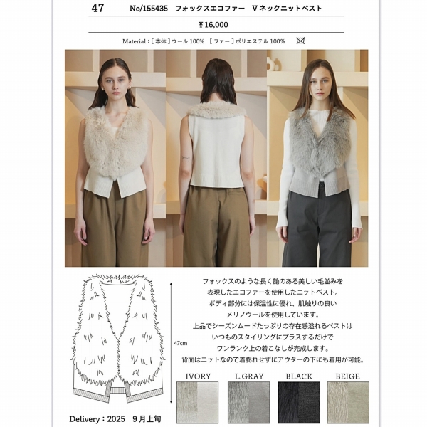 ボリュームのあるフォックスのような長く艶のある美しい毛並みを表現したエコファー/ニットベスト/ジレです。